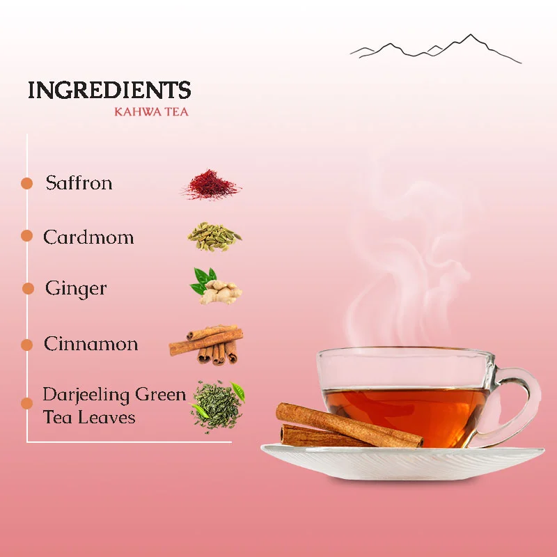Kahwah is a traditional preparation of green tea classic drink from the Himalayan valley that is soul-warming drink and resonates with the power of Indian spices. It is essentially a mix of whole spices cinnamon, cardamom, saron, and almonds with a warming effect. The richness of saron complements cardamom, and cinnamon, creating an unforgettable fragrance as the tea brews. Almonds and premium green tea harmonize with the spices, giving you a rich, delectable and refreshing brew.